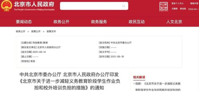 8月18日,北京市教委发布《北京市关于进一步减轻义务教育阶段学生作业负担和校外培训负担的措施》,通知中提到:依托12345市民服务热线,设立专门举报电话和举报邮箱,畅通监督举报途径,发挥群众监督举报、媒体监督作用。