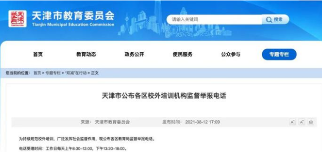 8月12日,为持续规范校外培训,广泛发挥社会监督作用,天津市教委公布了各区教育局监督举报电话。