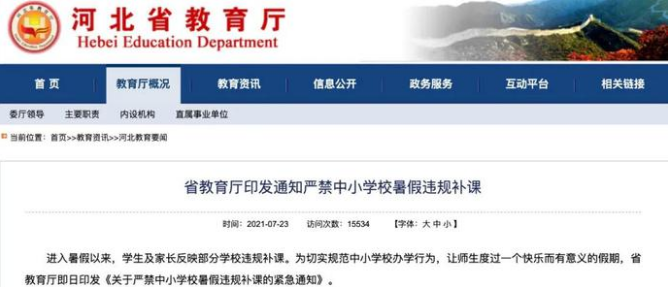 7月23日,河北省教育厅要求各级教育行政部门要积极主动查处中小学暑假违规补课行为,开通邮箱接收群众发来的照片、文字等举报材料,以此为线索、证据,有效查处违规补课行为。