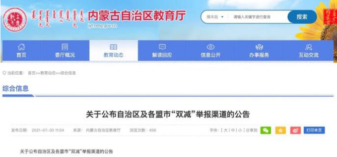 7月30日,内蒙古自治区教育厅公布自治区教育厅和各盟市教育(教体)局监督举报网络平台、电话、网址和邮箱。
