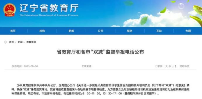 8月8日,为方便群众及时反映校外培训机构违法违规培训行为及在职教师违规补课线索等,辽宁省公布省、市监督举报电话。