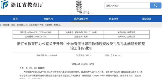 8月5日,浙江省教育厅印发了《关于开展中小学有偿补课和教师违规收受礼品礼金问题专项整治工作的通知》,要求全省严查整治中小学有偿补课和教师违规收礼。