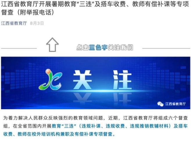 8月3日,江西省教育厅在全省范围内开展教育“三违”(违规补课、违规收费、违规推销教辅材料)及搭车收费、教师在校外培训机构兼职及有偿补课专项督查。