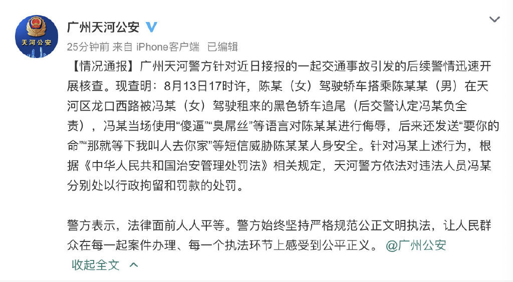 8月20日,广州天河公安官方微博发布情况通报,广州天河警方针对近日接报的一起交通事故引发的后续警情迅速开展核查。现查明:8月13日17时许,陈某(女)驾驶轿车搭乘陈某某(男)在天河区龙口西路被冯某(女)驾驶租来的黑色轿车追尾(后交警认定冯某负全责),冯某当场使用“傻逼”“臭屌丝”等语言对陈某某进行侮辱,后来还发送“要你的命”“那就等下我叫人去你家”等短信威胁陈某某人身安全。针对冯某上述行为,根据《中华人民共和国治安管理处罚法》相关规定,天河警方依法对违法人员冯某分别处以行政拘留和罚款的处罚。