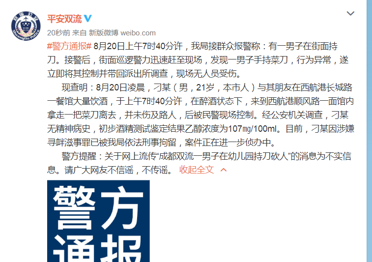 警方提醒:关于网上流传“成都双流一男子在幼儿园持刀砍人”的消息为不实信息。请广大网友不信谣,不传谣。