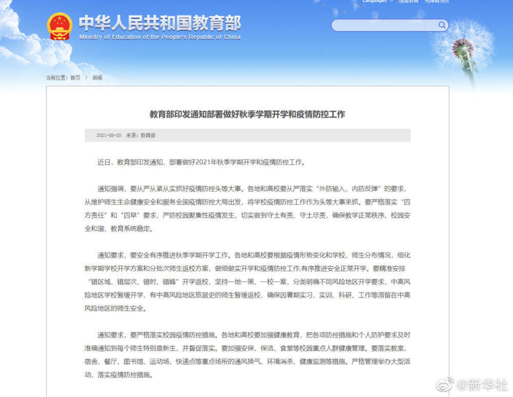 记者20日获悉,教育部近日印发通知部署做好2021年秋季学期开学和疫情防控工作。通知明确,要精准安排“错区域、错层次、错时、错峰”开学返校,坚持一地一策、一校一案,分类明确不同风险地区开学要求,中高风险地区学校暂缓开学,有中高风险地区旅居史的师生暂缓返校,确保因暑期实习、实训、科研、工作等滞留在中高风险地区的师生安全。详情>>>
