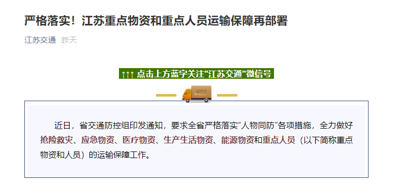 近日,江苏省交通防控组印发通知,要求全省严格落实“人物同防”各项措施,全力做好抢险救灾、应急物资、医疗物资、生产生活物资、能源物资和重点人员的运输保障工作。
