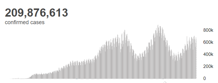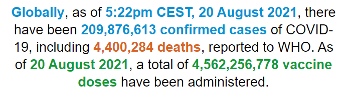 根据世界卫生组织最新实时统计数据,截至欧洲中部夏令时间8月20日17时22分(北京时间8月20日23时22分),全球新冠肺炎确诊病例累计达209876613例,累计死亡4400284例。20日全球新增新冠肺炎确诊病例650927例,新增死亡病例8600例。(总台记者 朱赫)