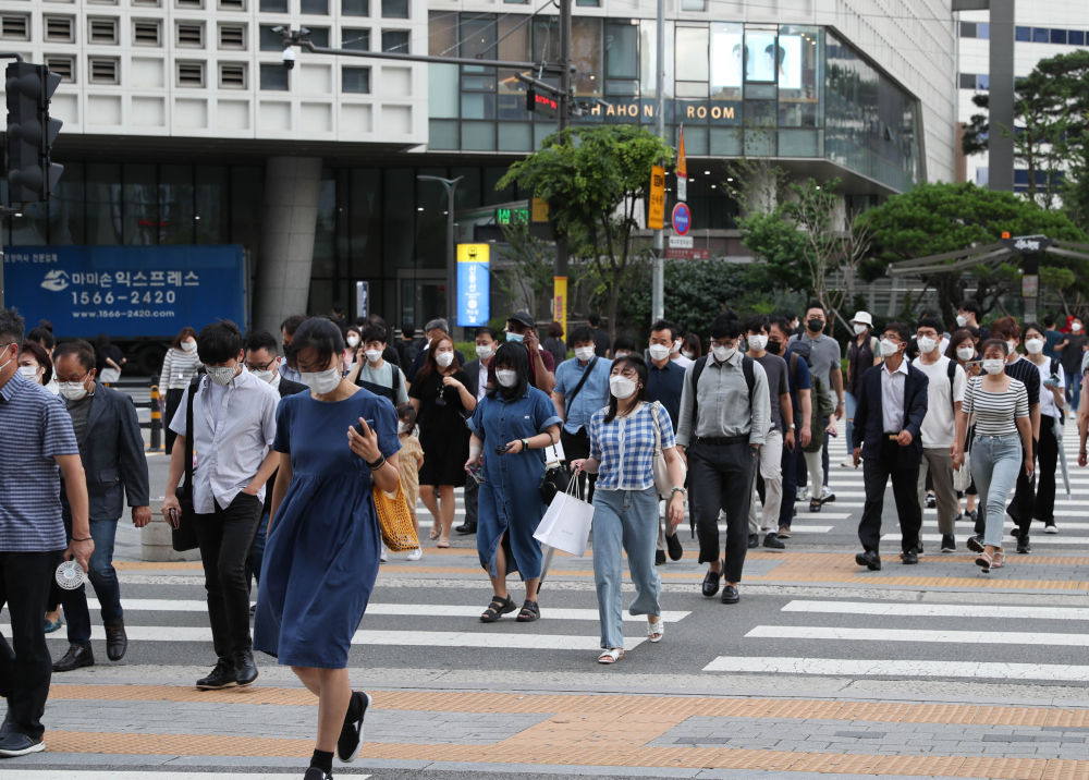 7月8日,行人佩戴口罩在韩国首尔过马路。(新华社记者王婧嫱摄)