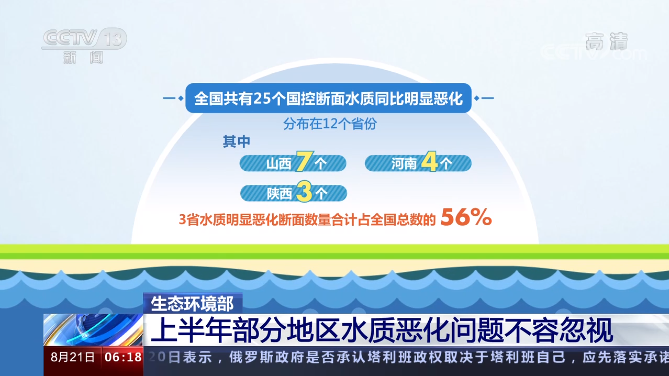 全国共有25个国控断面水质同比明显恶化,分布在12个省份。其中,山西7个、河南4个、陕西3个,3省水质明显恶化断面数量合计占全国总数的56%。
