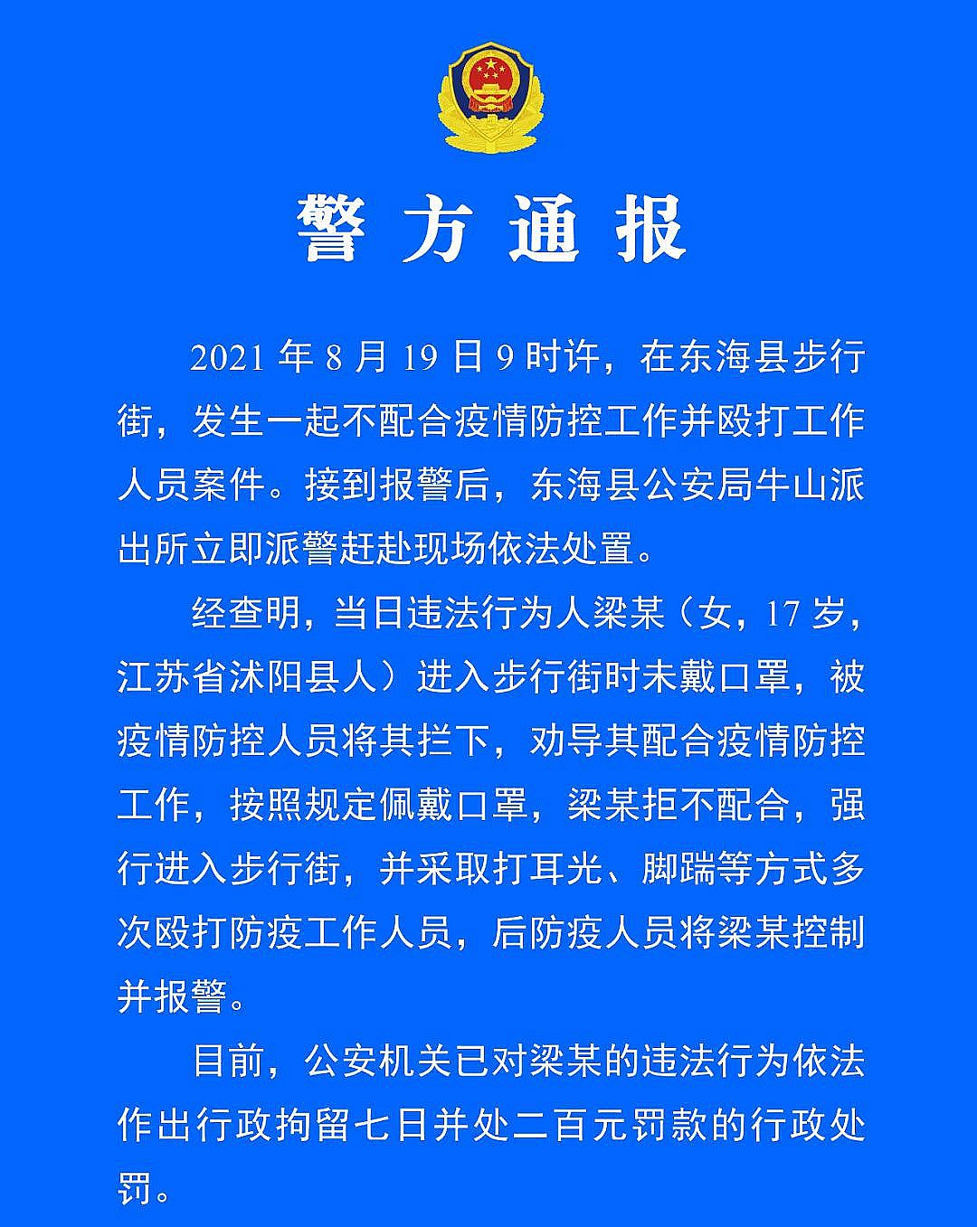 2021年8月19日9时许,在连云港市东海县步行街,发生一起不配合疫情防控工作并殴打工作人员案件。接到报警后,东海县公安局牛山派出所立即派警赶赴现场依法处置。
