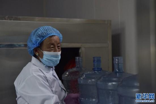 日喀则市丹珍桑曲天然山泉水厂员工正在清洗水桶(7月13日摄)。新华社记者 司源 摄