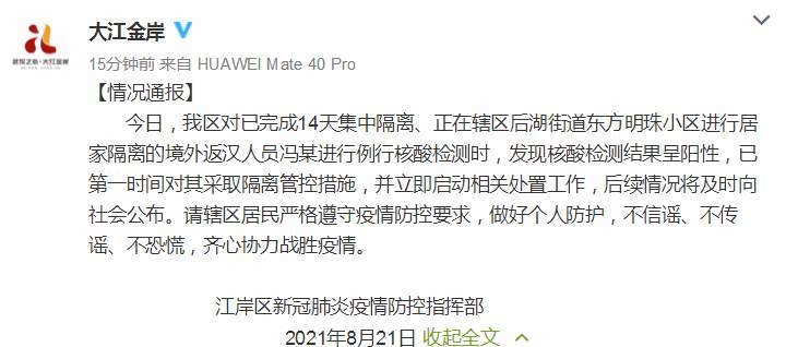 今日,我区对已完成14天集中隔离、正在辖区后湖街道东方明珠小区进行居家隔离的境外返汉人员冯某进行例行核酸检测时,发现核酸检测结果呈阳性,已第一时间对其采取隔离管控措施,并立即启动相关处置工作,后续情况将及时向社会公布。请辖区居民严格遵守疫情防控要求,做好个人防护,不信谣、不传谣、不恐慌,齐心协力战胜疫情。