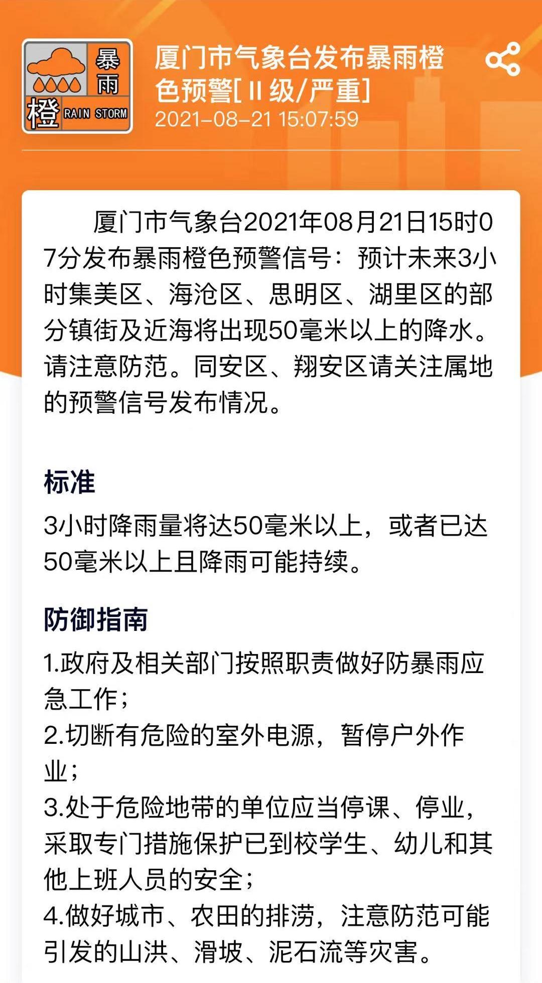厦门市气象台8月21日15时07分发布暴雨橙色预警信号:预计未来3小时集美区、海沧区、思明区、湖里区的部分镇街及近海将出现50毫米以上的降水。请注意防范。同安区、翔安区请关注属地的预警信号发布情况。