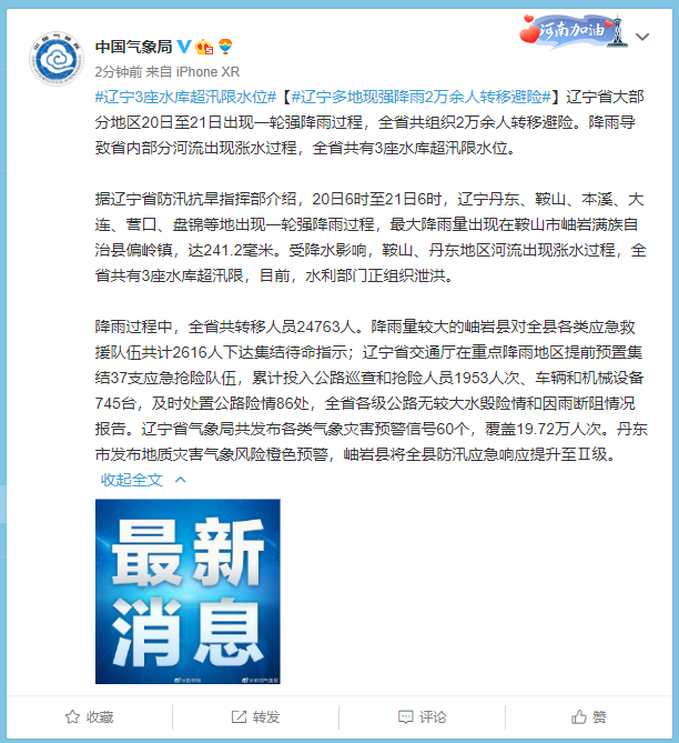 辽宁省大部分地区20日至21日出现一轮强降雨过程,辽宁省共组织2万余人转移避险。降雨导致辽宁省内部分河流出现涨水过程,辽宁省共有3座水库超汛限水位。