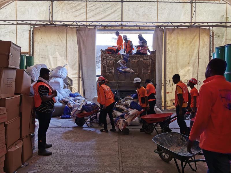 中企员工将海地华侨华人集资采购的物资装车运往灾区。图片由受访者提供