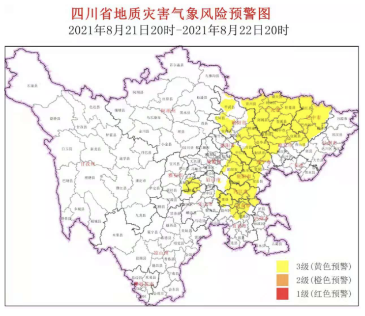 四川省地质灾害指挥部办公室发布全省地质灾害气象风险预警,时间为8月21日20时至8月22日20时,本次预警仍维持3级黄色预警,涉及14市69个县(市、区)。
