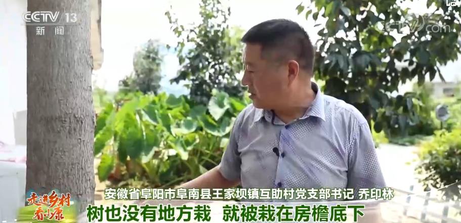 安徽省阜阳市阜南县王家坝镇互助村党支部书记 乔印林:这个树生长在房檐下非常艰难。(过去)庄台上因为居住拥挤,人没有地方住,都是一排挨着一排的房子。树也没有地方栽,就被栽在房檐底下。上面因为是房檐了,只有在缝隙中(拐弯生长)。