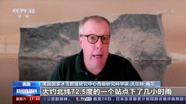 美国国家冰雪数据研究中心高级研究科学家 沃尔特·梅尔:过去这周格陵兰的最高点,海拔10500英尺,大约3200米,大约北纬72.5度的一个站点下了几小时雨,这是(有记录以来)没有过的。