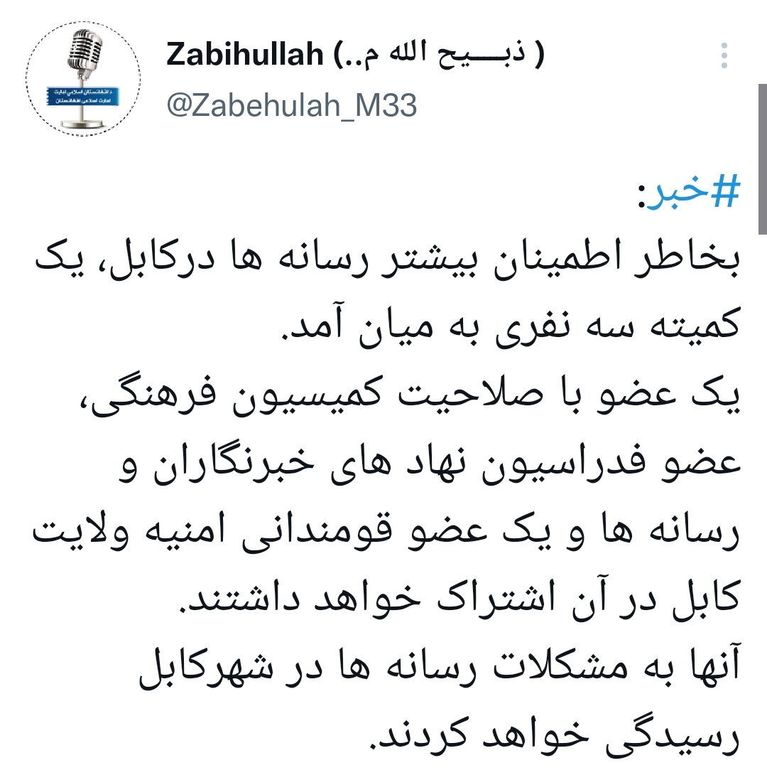 当地时间21日,阿富汗塔利班发言人扎比乌拉·穆贾希德在社交媒体上表示,已在阿富汗首都喀布尔成立了一个委员会,以回应媒体关心的事务。该委员会将由塔利班文化委员会一名负责人、记者与媒体机构联合会一名成员及喀布尔警察司令部一名成员组成。(总台记者 倪紫慧)