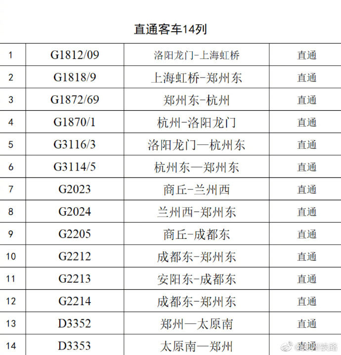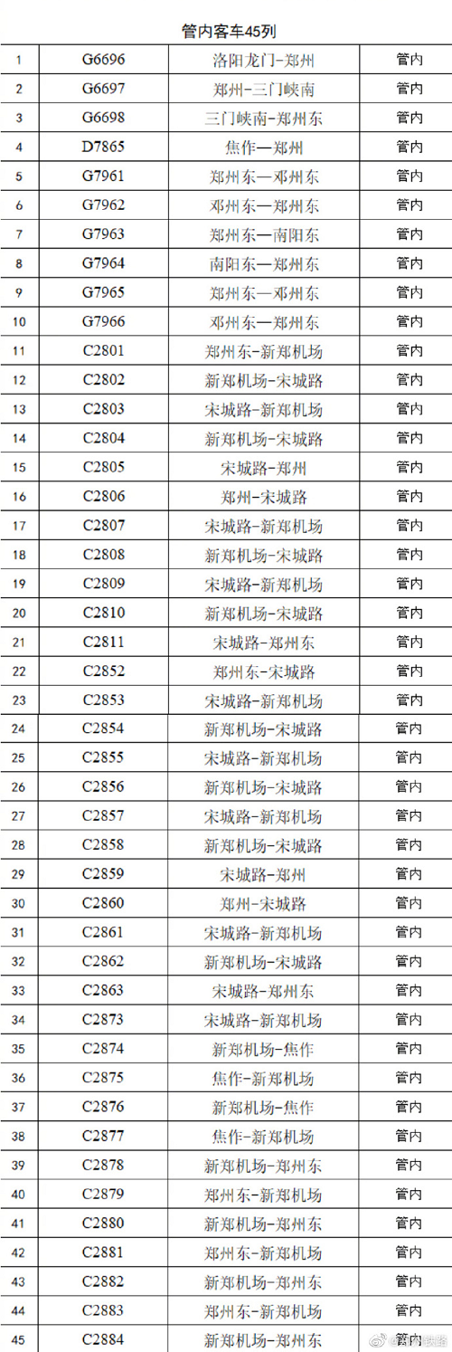 为保障旅客生命财产安全,积极应对即将到来的强降雨,中国铁路郑州局集团有限公司自8月22日零时起,对59列担当旅客列车停运一天。其中,直通客车14列,管内客车45列。