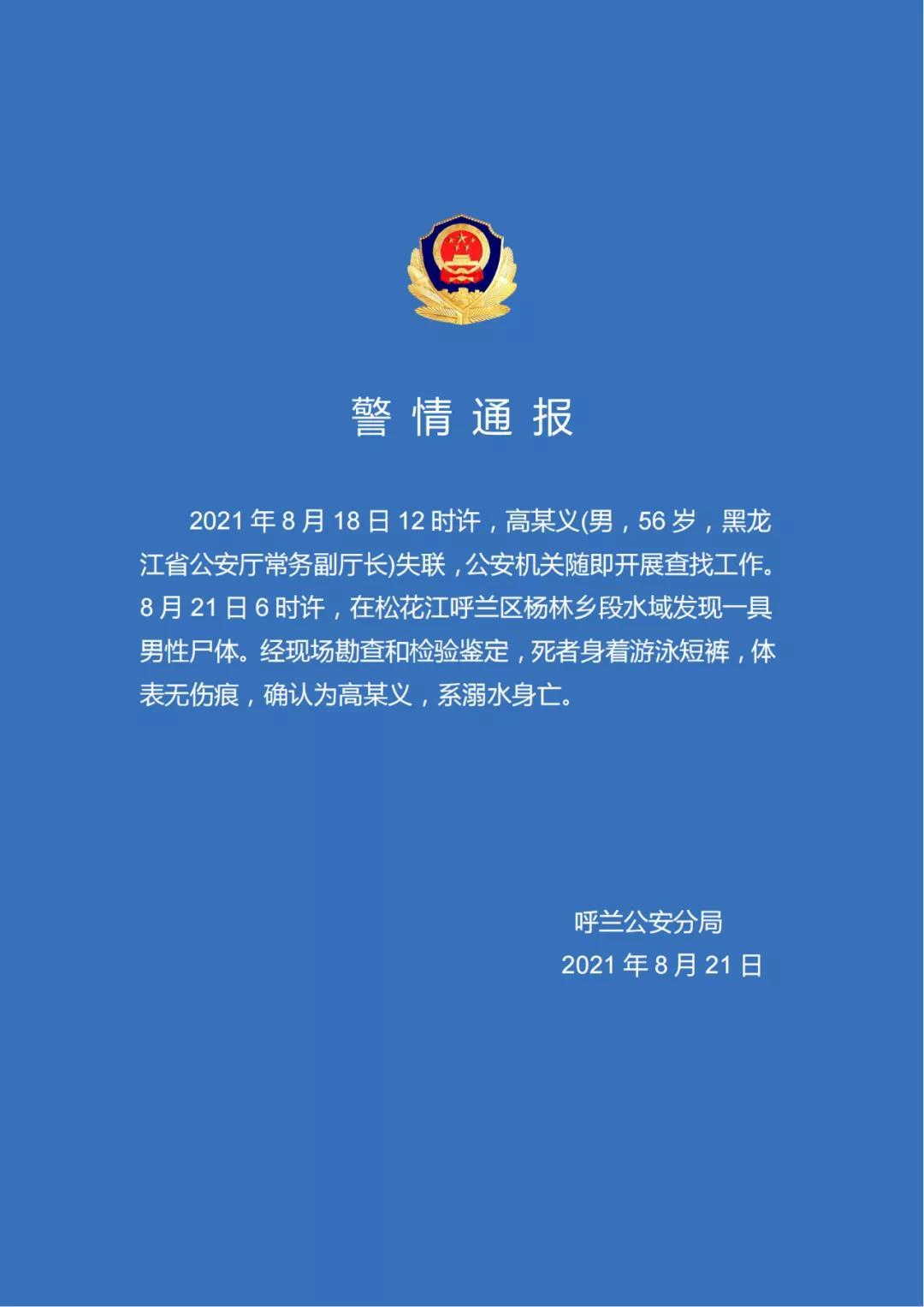 呼兰公安通报:日前失联的黑龙江省公安厅常务副厅长已溺水身亡。