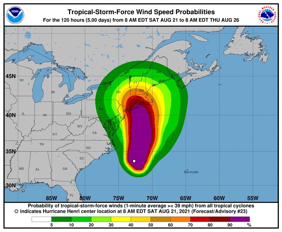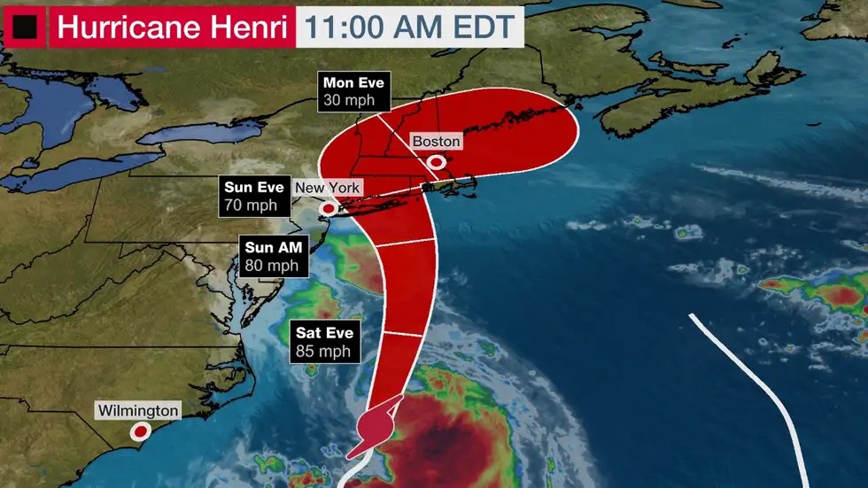 “亨利”预计将会在22日晚些时候在纽约州长岛或康涅狄格州到马萨诸塞州一带以飓风或接近飓风强度登陆,并继续向东北移动。