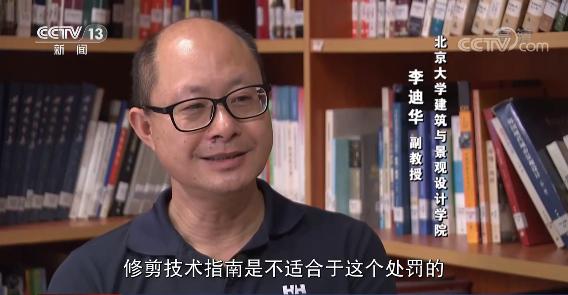 北京大学建筑与景观设计学院副教授 李迪华:修剪技术指南是不适合于这个处罚的,因为修剪技术指南是针对园林公司、园林行业的一个指南,这也是我前面质疑,这个处罚存在不合理、不合情的问题。真正要做的是什么,在处罚之前应该充分去调研这棵树是不是真正影响到居民的日常生活。如果确确实实是有必要进行修剪或者移走,那么只是存在一个程序不当和谁来移的问题。这些比树怎么修剪叫砍伐更加重要一些。