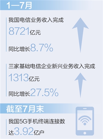 本报北京8月21日电 (记者韩鑫)工业和信息化部日前公布前7月我国通信业经济运行情况。数据显示,1—7月,电信业务收入稳步增长,累计完成8721亿元,同比增长8.7%。