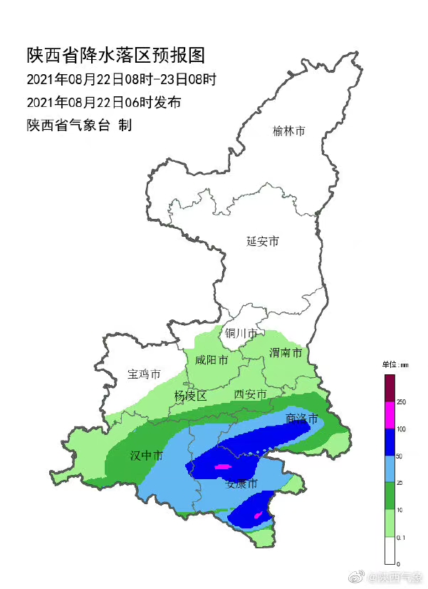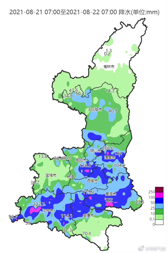 据陕西省气象台报: 8月21日7时到8月22日7时,陕西全省共有1662站出现降水,超过100毫米55站,最大渭南蒲城罕井站266.6毫米,勉县222.7毫米。超过50毫米418站,最大商洛镇安大坪镇站99.3毫米。