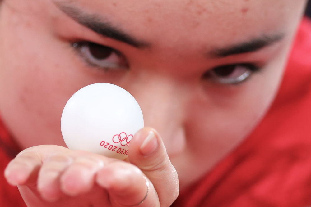 2021年8月2日,日本乒乓球选手伊藤美诚在比赛中发球。