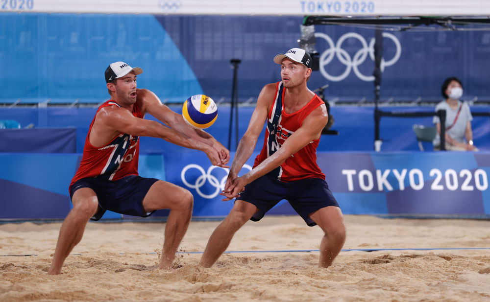 2021年8月5日,挪威组合莫尔(左)/瑟吕姆在比赛中。当日,在东京奥运会沙滩排球男子半决赛中,挪威组合莫尔/瑟吕姆战胜拉脱维亚组合普拉温斯/托奇斯,晋级决赛。