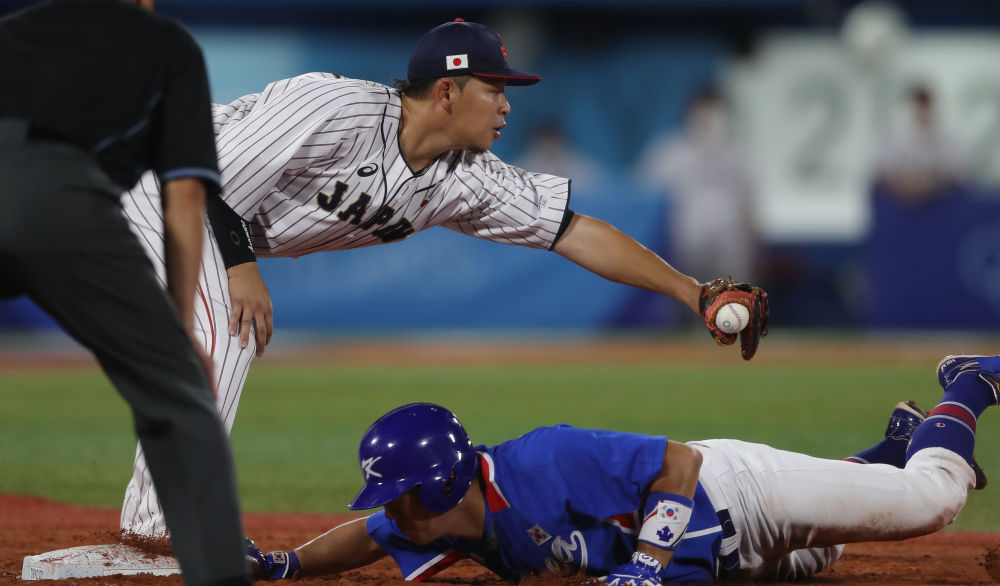 2021年8月4日,在东京奥运会棒球半决赛中,韩国队队员许敬民(下)在比赛中试图抢垒。
