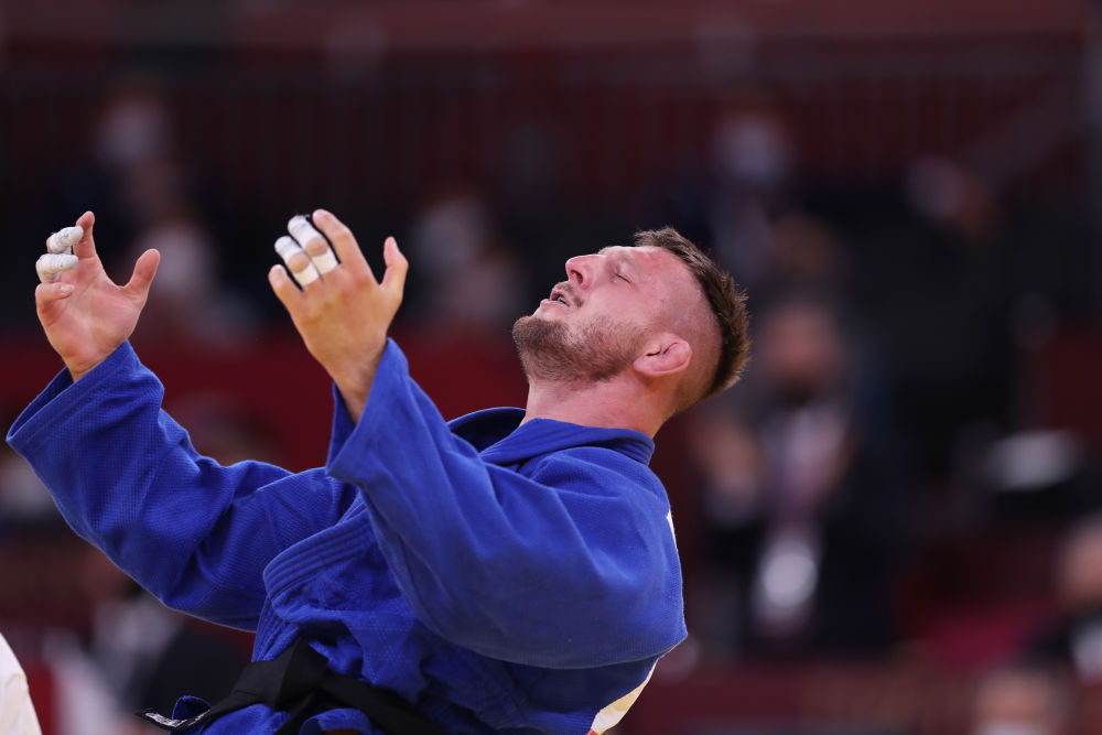 2021年7月30日,捷克选手克尔帕莱克在赛后庆祝。当日,捷克选手克尔帕莱克在东京奥运会柔道项目男子100公斤以上级决赛中战胜格鲁吉亚选手图希什维利,获得冠军。