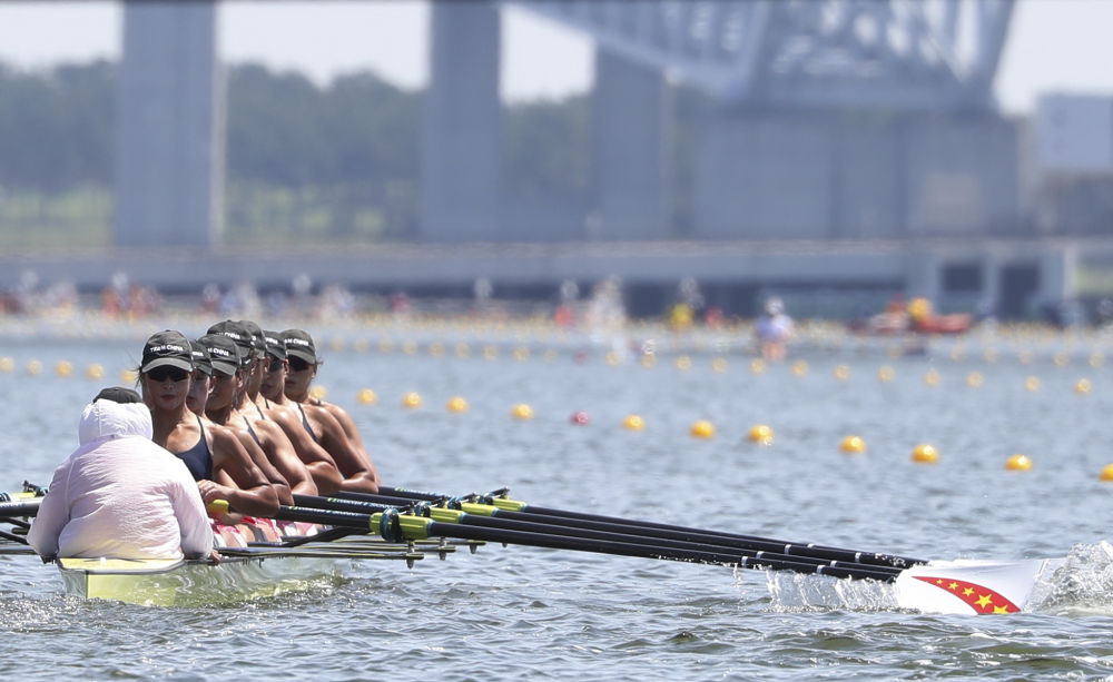 2021年7月20日,中国赛艇队女子八人单桨有舵手队员在在日本东京海之森水上竞技场进行训练,备战即将开幕的东京奥运会。