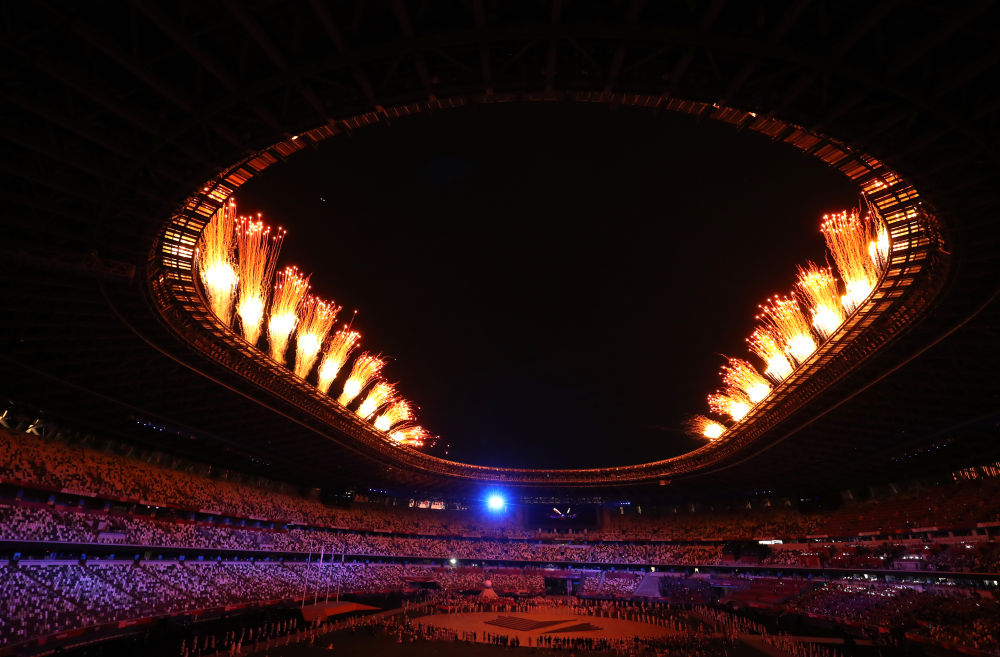 2021年7月23日在涩谷天空拍摄的开幕式期间的新国立竞技场。