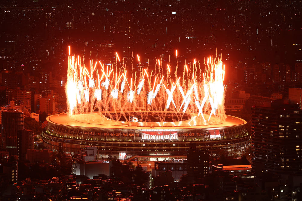 2021年7月23日拍摄的开幕式上的焰火表演。