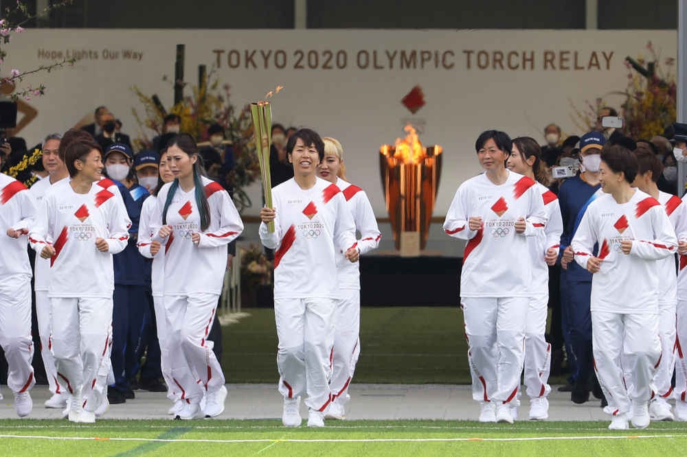 2021年3月25日,日本前女足队成员在火炬传递中。当日,东京奥运会火炬传递在日本福岛国家足球训练中心拉开帷幕,在2011年德国女足世界杯中夺冠的日本女子国家队部分成员成为第一棒火炬手。