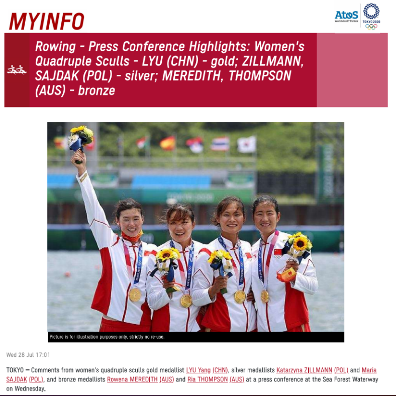 奥运会上,赛艇是我主要负责的运动项目。我在现场见证了中国队女子四人双桨项目在决赛中远超第二名获胜,时隔13年再次夺得金牌;我见证了中国队在男子双人双桨中一路领先,但最后冲刺时被反超,最终获得铜牌,拿到了奥运会男子赛艇项目在亚洲的第一枚奖牌;我见证了中国队在女子八人艇项目中从复活赛到决赛夺取铜牌;我见证了中国队在男子四人双桨项目B组决赛中第一名完成比赛后,激动庆祝的样子,虽没有奖牌,但仍然拼尽全力比赛……赛艇在国内关注度并不高,而且这类项目的训练需要与寂寞和暴晒为伴,是个苦差事,但运动员的努力和团结协作在东京奥运的赛场上得到了回报。