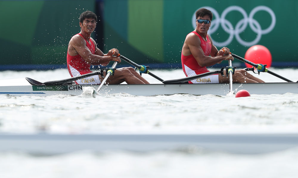 2021年7月28日,刘治宇(左)/张亮在比赛中。当日,在东京奥运会赛艇项目男子双人双桨决赛中,中国组合刘治宇/张亮获得铜牌。
