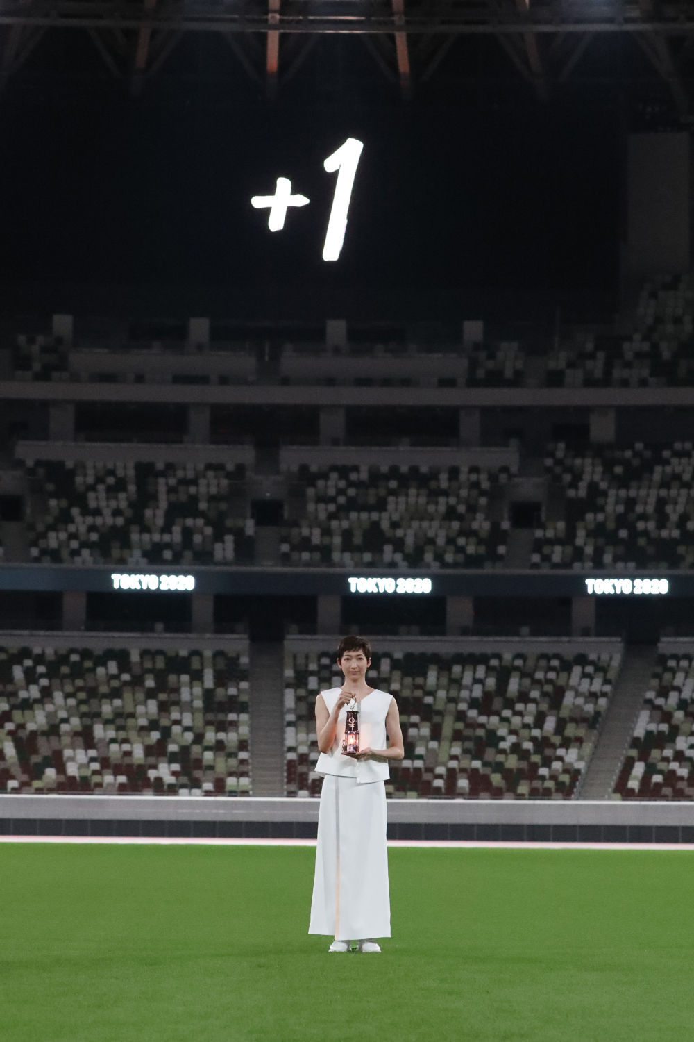 2020年7月23日,在日本东京奥林匹克体育场,日本游泳运动员池江璃花子手持奥运圣火火种。