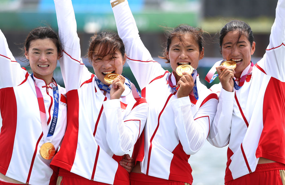 2021年7月28日,中国队在比赛后庆祝。当日,在东京奥运会赛艇项目女子四人双桨决赛中,中国队夺得冠军。