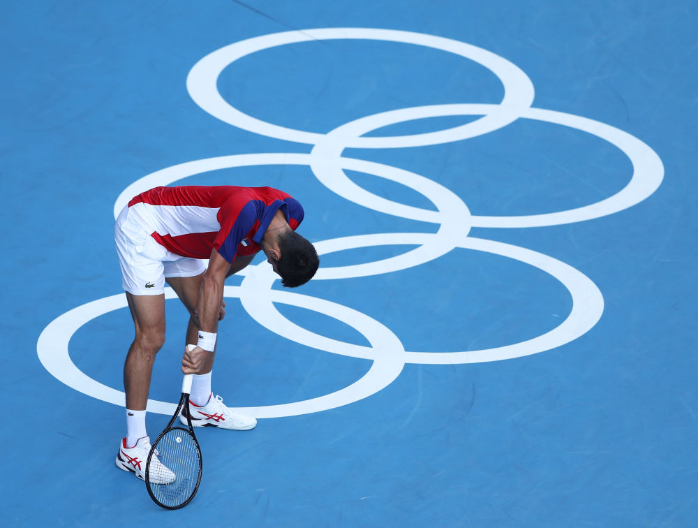 2021年7月31日,焦科维奇在比赛中。当日,在东京奥运会网球项目男子单打铜牌争夺战中,塞尔维亚选手焦科维奇不敌西班牙选手布斯塔,无缘奖牌。