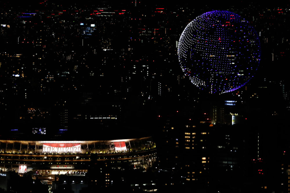 2021年7月23日拍摄的开幕式上的无人机表演。