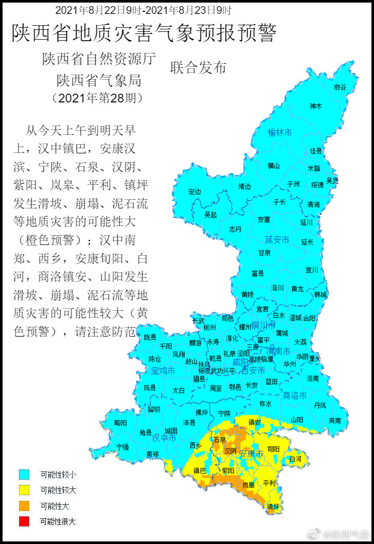 陕西省自然资源厅与陕西省气象局联合发布地质灾害气象预报预警: