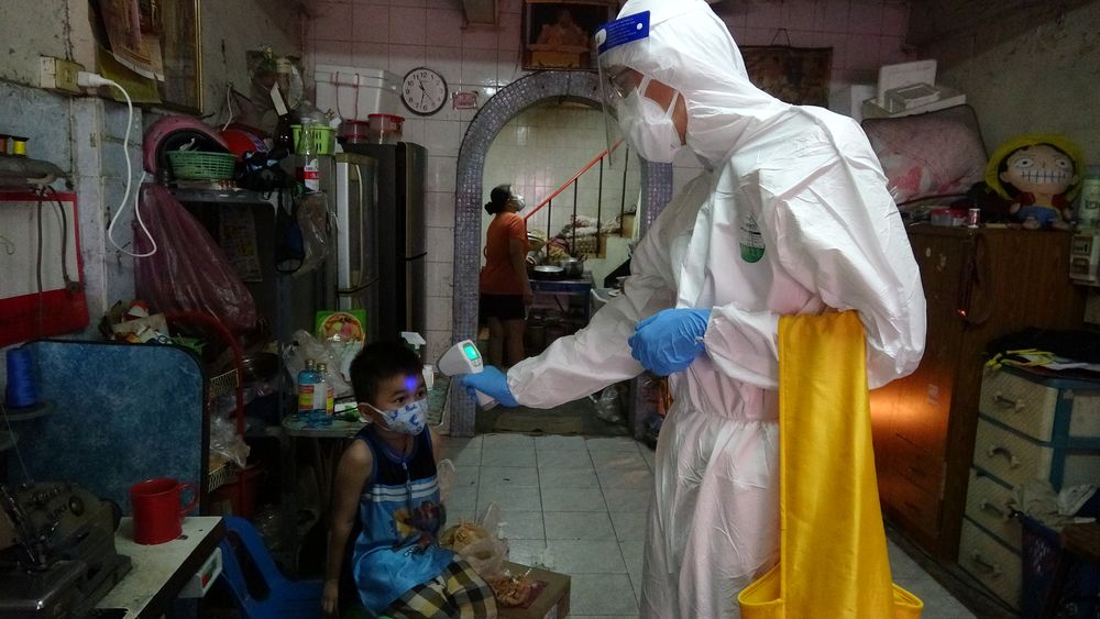 8月8日,泰国曼谷素提沃拉兰寺庙的副住持彭蓬在寺庙附近社区一户人家为一名儿童测量体温。新华社发(任芊 摄)