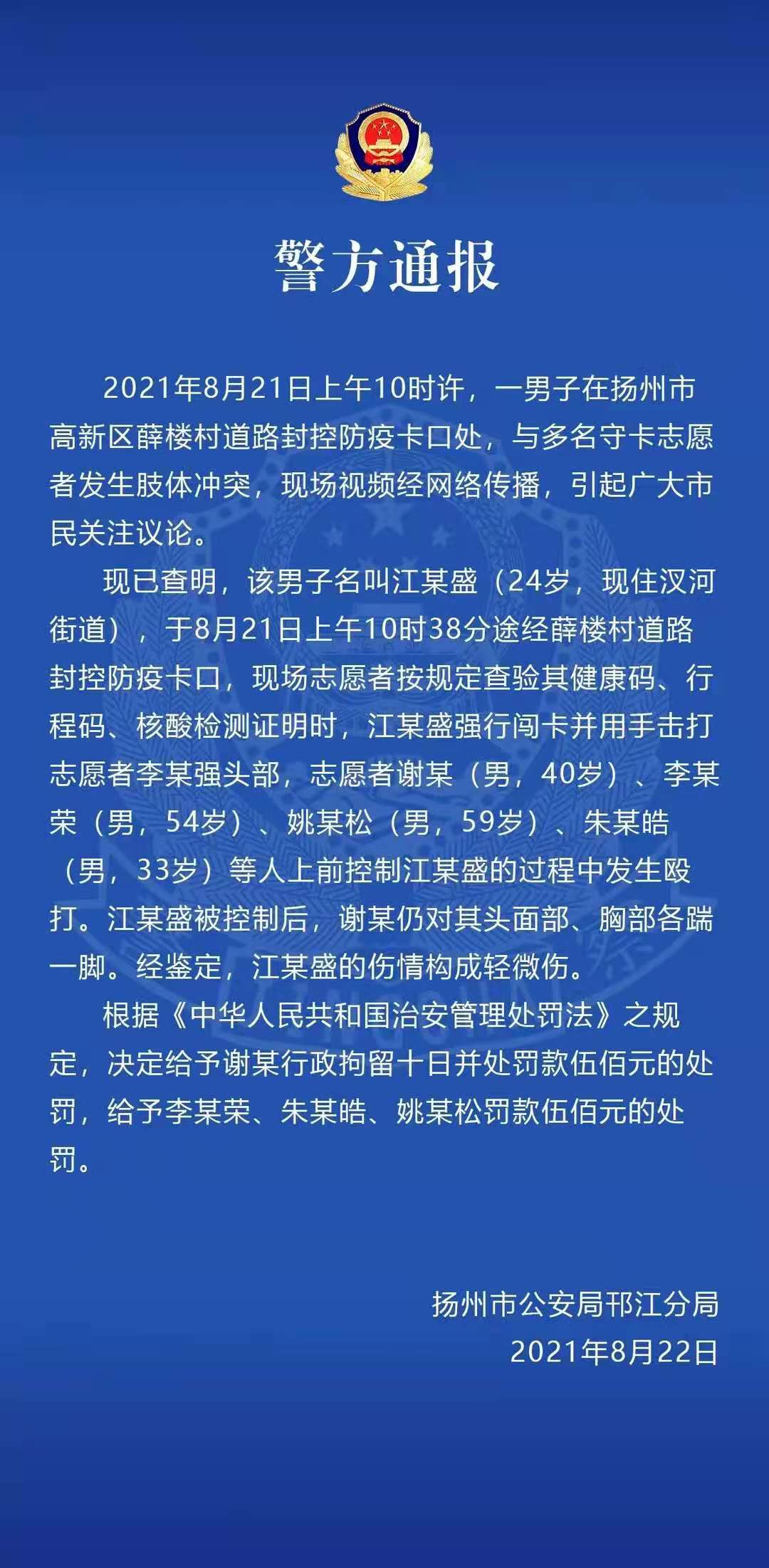 江苏省扬州市公安局邗江分局8月22日发布通报:2021年8月21日上午10时许,一男子在扬州市高新区薛村道路封控防疫卡口处,与多名守卡志愿者发生肢体冲突,现场视频经网络传播,引起广大市民关注议论。