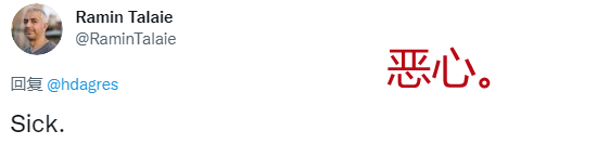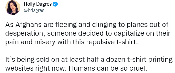 美国智库大西洋理事会研究员、伊朗裔美国人霍莉·达格雷斯在推特上说:“当阿富汗人出于绝望而逃离并紧紧抓住飞机时,有人决定利用他们的痛苦和悲惨来卖钱,设计出这件令人厌恶的T恤……它现在至少在6个印刷T恤网站上出售。人类竟可以如此残忍。”