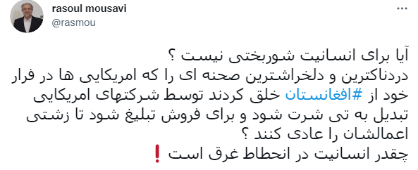 伊朗外交部西亚司司长穆萨维发推说:“美国人在逃离阿富汗时制造的最痛苦、最令人心碎的场景,已经变成了一件T恤……这真是人性的堕落!”
