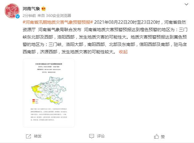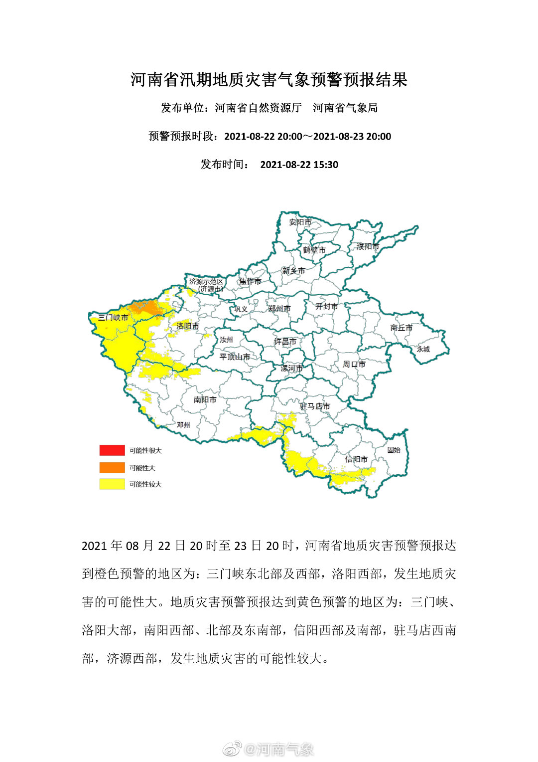央视网消息:2021年08月22日20时至23日20时,河南省自然资源厅、河南省气象局联合发布河南省地质灾害预警预报达到橙色预警的地区为:三门峡东北部及西部,洛阳西部,发生地质灾害的可能性大。地质灾害预警预报达到黄色预警的地区为:三门峡、洛阳大部,南阳西部、北部及东南部,信阳西部及南部,驻马店西南部,济源西部,发生地质灾害的可能性较大。